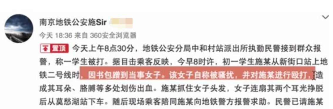 据南京地铁公安民警施大江介绍,6月29日上午8点30分,地铁公安分局中和村站派出所执勤民警接到群众报警,称一学生被打。据目击乘客反映,今早8时许,初一学生施某从新街口站上地铁二号线时,因书包蹭到当事女子。
