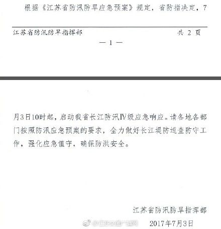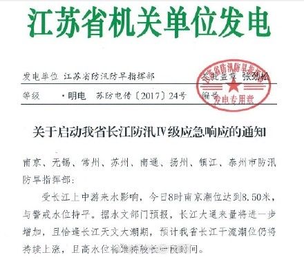 荔枝新闻讯 江苏省防汛防旱指挥部授权,江苏省水文水资源勘测局2017年7月3日9时发布长江洪水蓝色预警:受长江上游来水影响,7月3日7时南京潮位8.50m,与警戒水位持平,预计仍将持续上涨,且高水位将维持较长一段时间。10点起,启动我省长江防汛四级应急响应。请有关单位及社会公众密切关注水位变化,做好防范措施。