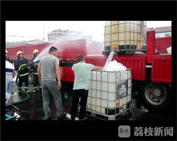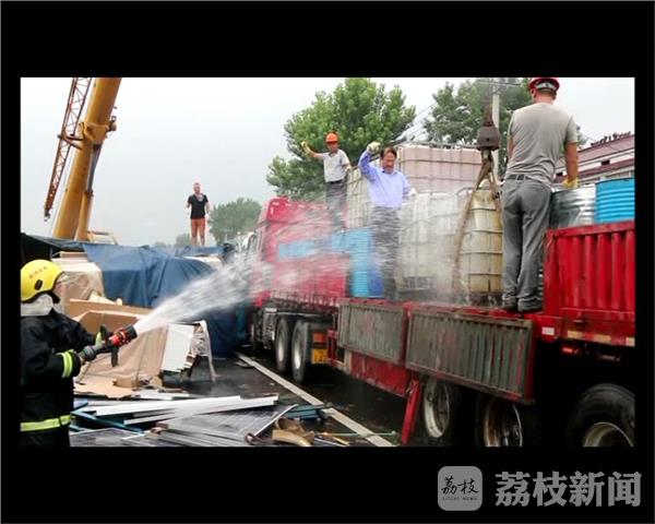 7月1日上午8时27分,淮安市淮阴区王营消防中队接到119指挥中心调动命令,称位于淮阴区渔沟镇韩圩街泗阳往淮安方向大货车追尾,车上装着的稀释剂发生泄漏,情况十分危急。中队立即出动4辆水罐车、共16名消防官兵赶赴现场。