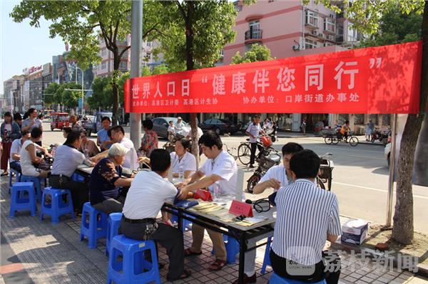 2017年7月11日是第28个世界人口日,当日上午,由泰州市高港区卫计委、计生协会主办的,以“健康伴你同行”为主题的世界人口日宣传活动在口岸街道办广场开展。现场设置了医疗健康服务、政策宣传咨询台,为广大居民群众提供便捷的免费义诊及健康咨询服务。