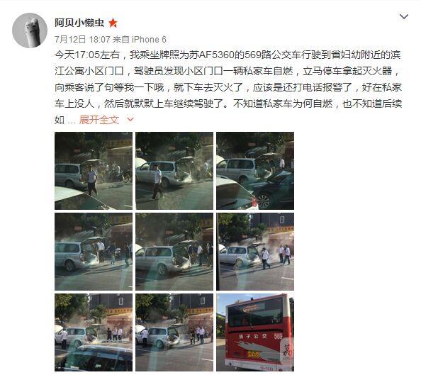 7月12日晚,有网友发微博讲诉了一件暖心事:当天晚高峰她乘坐的569路公交车行驶到省妇幼附近一小区门口,司机发现一辆商务车正由内往外冒烟,然后和乘客打声招呼后就拎着灭火器前去灭火,整个过程网友用手机拍了下来,司机回到车上还连声向乘客表示抱歉,网友说,司机的举动让人心里暖暖的。