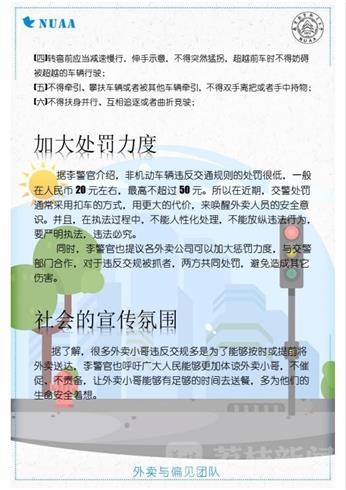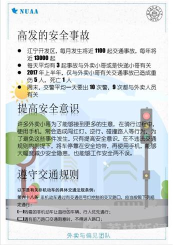 “小外卖背后也有大隐患!”近日,南京航空航天大学“外卖与偏见”暑期社会实践团队成员在学校附近商场周围化身法律宣传员,与交警合作向外卖小哥分发自制的安全手册,普及交通安全知识。“很多外卖骑手太过重视外卖速度,违反交通法规,甚至丢掉性命,非常可惜!”此次活动的副队长陈齐炎说道。