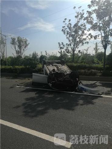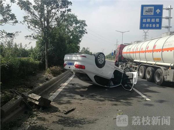7月14日下午3点半左右,有市民报警称,一辆白色轿车“四脚朝天”仰翻在泰州市长江大道上,不知道有没有人受伤。