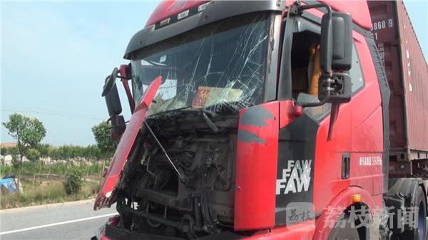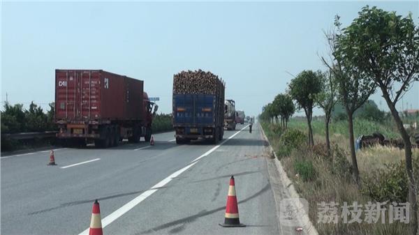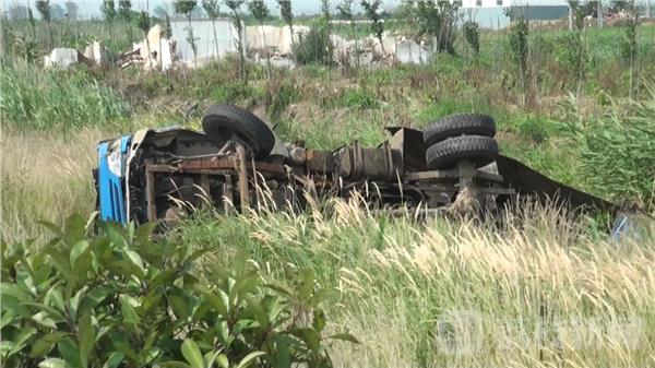 记者赶到现场时看到,事故处理民警已经封闭了快车道和非机动车道,只留一股行车道供车辆缓慢通行,一辆红色的大货车头朝北停在由南向北的快车道里,车头右角因受到撞击而破烂不堪,前挡风板变形翘起,在路右侧的公路绿化护坡上,一辆绿色的小货车头朝西侧翻在那里,整个车厢散架,驾驶室严重变形,一名男子仰面躺在车头那里,已经没有了生命迹象。在南侧的路面上,有长长的车辆失控后留下的痕迹,护坡上的绿化大面积倒伏,说明车辆失控后翻滚到现在的位置。
