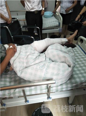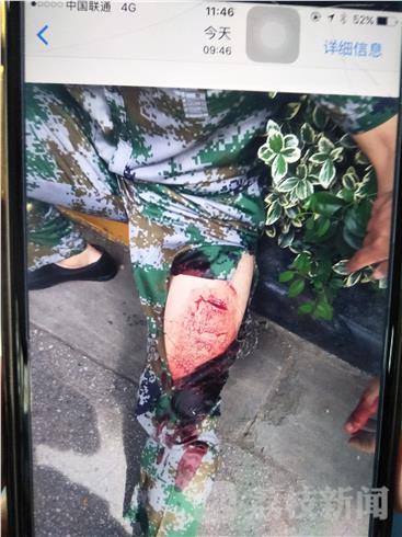 小区保安 张师傅:“他跑回家出来就拿着一把刀,我就往后退,他说要砍我,然后班长就及时过来把他拦住。我背对着他,他追着我砍,砍到我后背还有大腿。经检查,小区保安张师傅左腿被砍伤,缝了20多针,目前正在同仁医院接受治疗。”