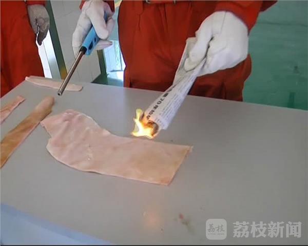 消防队员用点火器去接触涂抹了防晒霜的猪皮,不过很显然,并没有明显的起火现象。