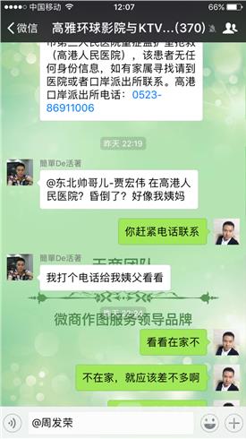 据报警人陈先生讲,当天晚上8点左右,他带孩子散步,突然看见前面一个老太太走路“歪歪的”,然后就坐在地上,随后他快步上前询问,老太太说头晕随即倒在地上。陈先生见状立即报警,很快120急救赶到现场将老太带回医院抢救。到医院后发现,老太身上无任何信息,无法联系到家属。最后,泰州市第三人民医院医生护士发朋友圈寻找家属。当晚九点开始,泰州高港微信朋友圈内开始大量转发寻找病人家属的信息,一时间全城都在寻找病人家属。很快,在一个微信群里,有微信网友称疑似是他姨妈,随后他立即拨打姨父电话,姨父称姨妈不在家,随后几位家属立即赶到医院进行确认,正在抢救的是其是家属。老太的家属称,晚饭后老伴说出去散步,很晚了还没回来,准备出去找时,亲戚来电话说可能“出事”了。家属说,老伴身体属于亚健康状态,就住事发地西侧的小区里。