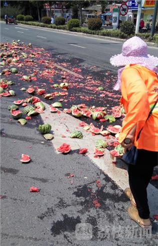 笔者在现场看到,整个地面上有二十多米长范围的两股车道上满是碎裂的西瓜,地面上流淌了鲜红的西瓜汁,附近负责路面保洁的两名环卫女工发现后立刻赶到现场进行清理,临近中午时分,此时户外温度高达37度,两名环卫女工顶着烈日清理地面上的西瓜,就在拍摄过程中一名热心的路人也加入帮忙清理。