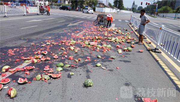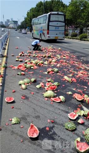 7月20日中午11点左右,淮安市淮阴区北京北路上一辆白色货车在路口转弯过程中货物发生倾翻,百只西瓜坠落地面,随后司机从地上捡走挡板和木板后开车溜了。
