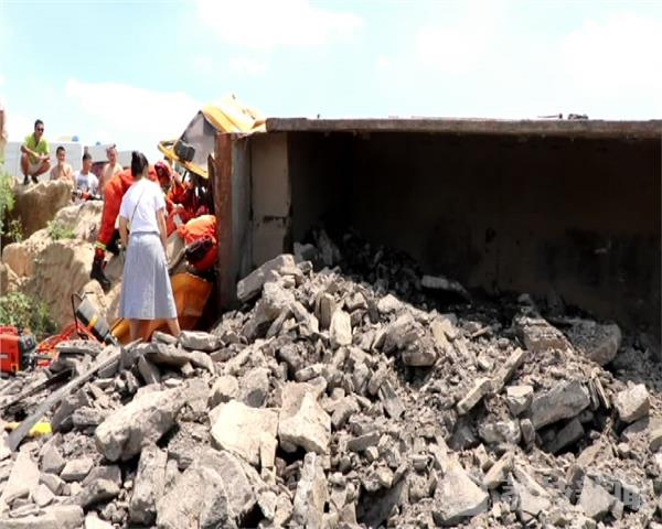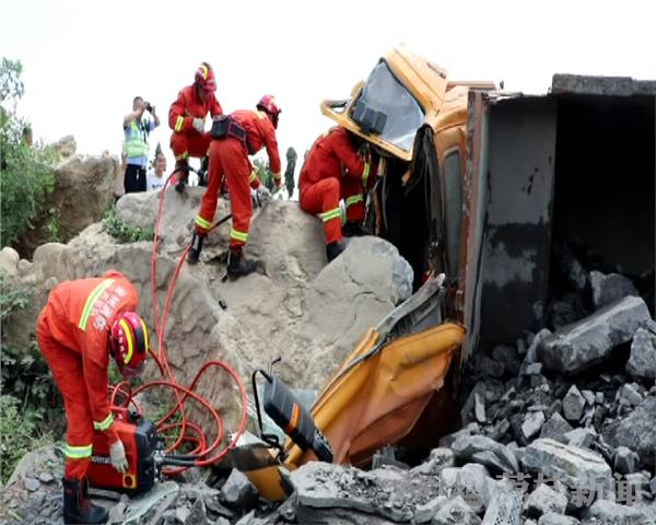 7月20日中午12时11分,徐州市铜山区房村镇郭集村唐山上,一辆装满石块的自卸王侧翻在路边,车头撞在大石头上,车头已经严重变形,驾驶室紧贴在地上司机腿部被卡,救援人员只能通过一条缝才能看到被困司机。中队消防员利用扩张器将一条缝一点一点的扩大,空间比较狭小,只能下去一人。另一名救援人员趴在石头上半个身子下去协助救援。炎热的天气救援人员大汗淋漓,但仍坚持争分夺秒进行救助,最终利用固定抬板救出被困司机,将其送往120救护车。