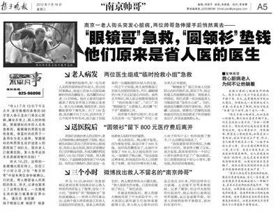 2012年7月13日下午五点半,家住南京鼓楼四条巷的68岁杨老出门突发心脏病,瘫坐在地上,大汗淋漓,喘得厉害、路人纷纷相助,穿圆领衫的年轻人买来急救药,戴眼镜的男医生就地急救,还有一位蓝衬衫一直为老人遮雨。这一幕被路人拍了下来。安顿好患者的家属找不着热心帮忙的陌生人,于是求助于媒体,在现场照被放上微博后三小时,好心人就被“人肉”出来——他们中的两人,戴眼镜的是江苏省人民医院心内科的陈红武医生,“圆领衫”是麻醉科的高苏麟医生。