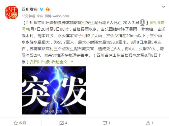 四川凉山州普格县发生泥石流 8人死亡17人失联
