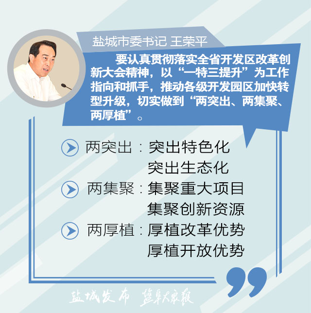 王荣平指出,“两厚植”,就是厚植改革优势、厚植开放优势。深化园区管理体制、建设运营体制和行政审批制度改革,建立精简高效的扁平化行政管理体制,大力推进“2330”试点试验,探索多元化的开发园区运营模式,努力打造审批环节最少、办事效率最高、服务质量最好、营商成本最低的区域。要更大力度“引进来”、更加有效“走出去”,加快专业化招商队伍建设,提高引进外资的层次和质量,支持企业参与境外资源项目合作开发,鼓励拓展对外经济技术合作方式,实施本土跨国企业培育工程。同时,不断放大合作园区效应,积极创建中国(江苏)自由贸易试验区盐城片区,加快中韩盐城产业园区建设,加大与上海、苏南等地合作共建力度,高起点高标准推进滨海新区、沪苏(大丰)产业联动集聚区等重大载体建设,深入融入全球产业链、创新链、价值链。