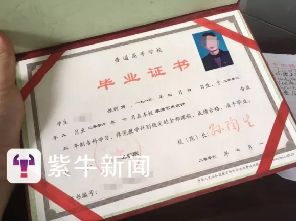大专毕业后,他取得了毕业证书,证书上贴着他入学时拍摄的证件照,显示的证书主人名叫林泉,证书左下角有一串证书编号并盖有学校公章。但是林二泉告诉紫牛新闻记者,虽然这证书看起来没啥问题,但是在学信网上仔细查询还是有端倪,他的学历证书后台身份证号码是林波的。