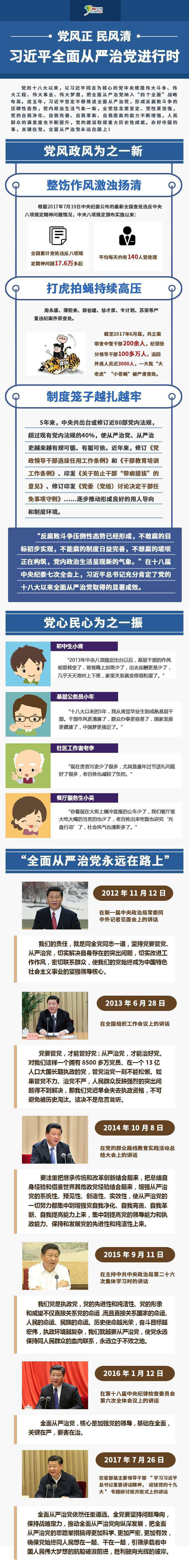 党的十八大以来,以习近平同志为核心的党中央统揽伟大斗争、伟大工程、伟大事业、伟大梦想,把全面从严治党纳入“四个全面”战略布局。这五年,习近平坚定不移推进全面从严治党,形成反腐败斗争的压倒性态势,党内政治生活气象一新,全党信念更坚定、党性更坚强,党的自我净化、自我完善、自我革新、自我提高的能力不断增强,人民群众的满意度也不断提升,党的建设取得重大历史性成就。办好中国的事,关键在党。全面从严治党永远在路上!