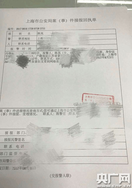 今天下午,据爆料人陈岚独家提供给央广网记者的报案回执单显示,她已将收集好的相关证据交由上海市闵行区颛桥派出所。目前,陈岚正在等待警方回复。