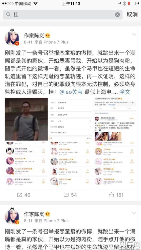 但这也只是陈岚的猜测。这几天,她翻阅自己过去的微博评论察觉到,该事件发生之前有个叫李凛之的微博账号,是平时辱骂她最积极的打手,也是之前她在微博上挂过的“恋童癖”。