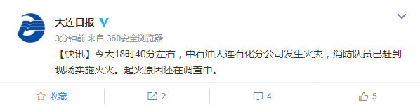 @北京青年报 消息称,今日晚间7时许,有大连市民称,位于大连甘井子区的中国石油天然气股份有限公司大连石化分公司发生火灾。北青报从市民市民拍摄的视频中看到,在大连市区多地均可看到该公司所在的位置发生火灾,有些地方可见火焰和大量的浓烟。大连石化分公司的工作人员表示,确实发生了火灾,具体情况现在还在调查。大连市公安消防局的工作人员表示,消防人员现在已经在现场进行灭火,但未发生过爆炸。截至8点10分,火灾还未完全扑灭,暂无人员伤亡报告,起火原因正在调查中。