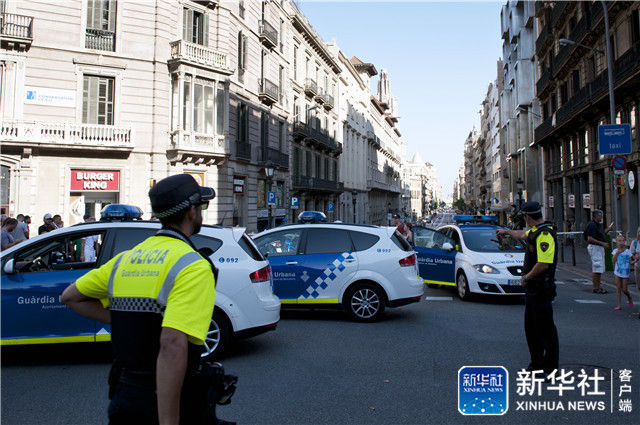 8月17日,在西班牙巴塞罗那,警方在发生汽车撞人恐怖袭击事件后封锁现场附近道路。新华社发(利诺·德瓦利耶摄)