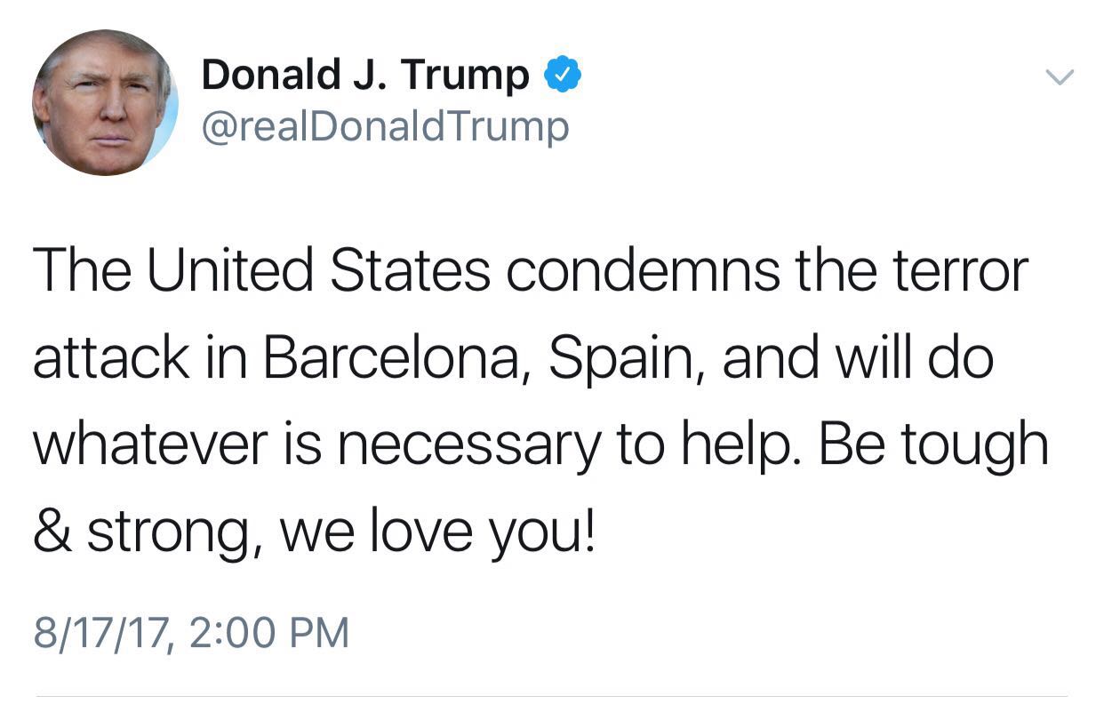 特朗普当天在社交媒体推特上表示,美国将竭尽全力提供必要的帮助。他说,“(巴塞罗那)要坚强起来,我们爱你!”