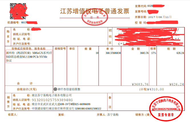 南京的消费者吴先生告诉荔枝新闻记者,他是8月11日在苏宁易购官网看到了这款硬盘,上面标注的价格是431元,当即下单,并付款430.72元(另有0.28元优惠)。下单后系统即提示,他的订单已经审核通过,并称“此商品由厂家配送”。并且还出具了电子发票。