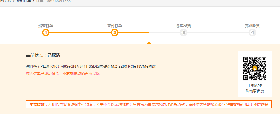 荔枝新闻讯(荔枝全媒体记者/袁锦生、蒋正) 最近几天,荔枝监督连续接到多起消费者投诉,称他们在苏宁易购网站上购买了一款浦科特SSD硬盘,订单下了,款也付了,苏宁易购也出具了电子发票,可就在消费者等着发货的时候,订单却被苏宁易购取消了。