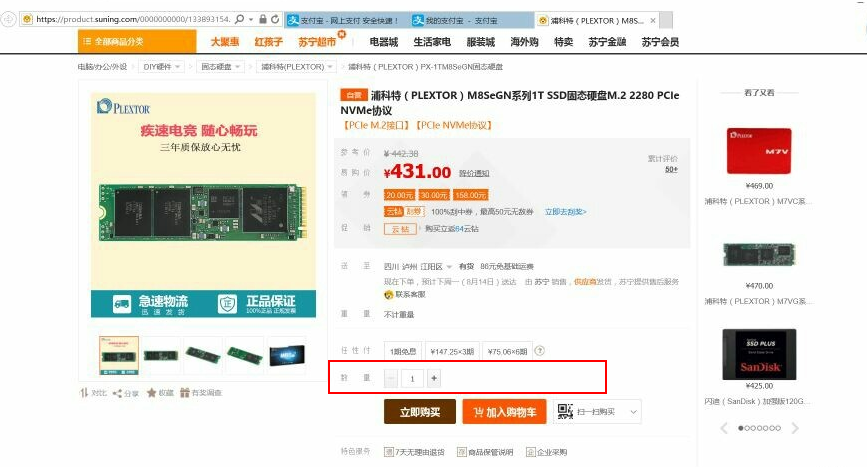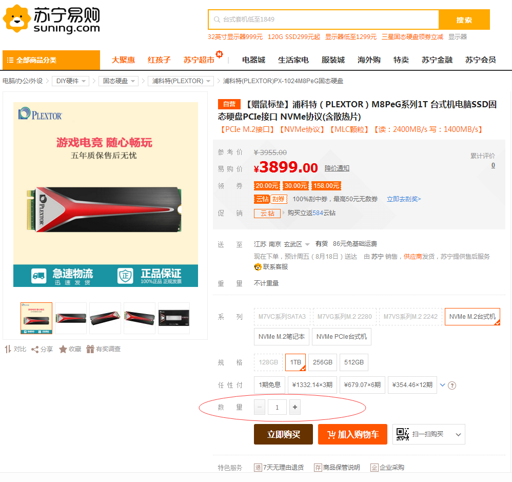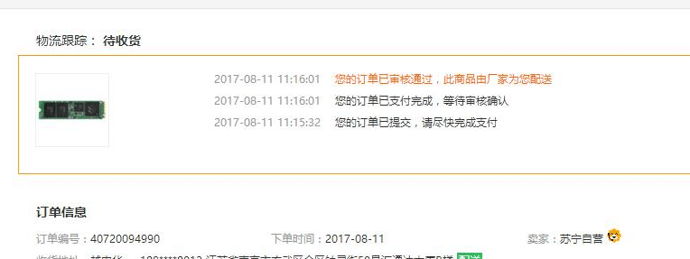 向荔枝监督投诉的越先生则告诉记者,他本身是从事软件行业的,对电脑硬件的行情比较了解。这些天,苏宁易购在宣传“818发烧购物节”,所以他一直在关注苏宁易购的网站上会不会有高档硬盘的优惠。8月11日,他正好看到了这款浦科特的SSD硬盘,优惠幅度比较大,他当时还感叹:“苏宁易购为了818,也真是拼了!”当即点击购买。