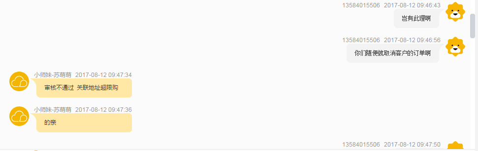 对吴先生的几点质疑,客服人员并不直接回应,只是像车轱辘一样反复的说明:苏宁易购取消订单的原因就是同一地址超限购,审核不通过,规定就是这样。