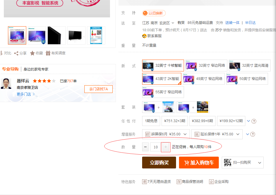 苏宁易购官网上参加优惠活动的商品设置的限购界面