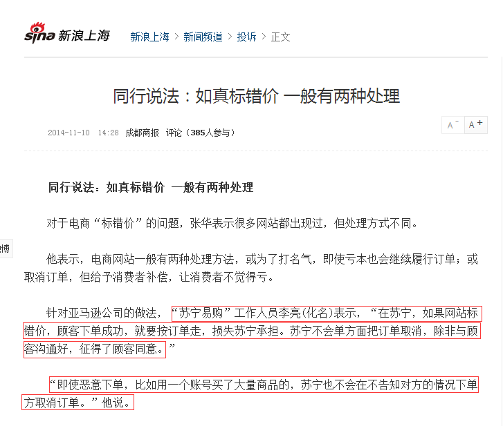 有意思的是,这篇报道中,记者还采访了苏宁易购的一位工作人员,询问苏宁易购如果出现“网站标错价格会如何处理?”