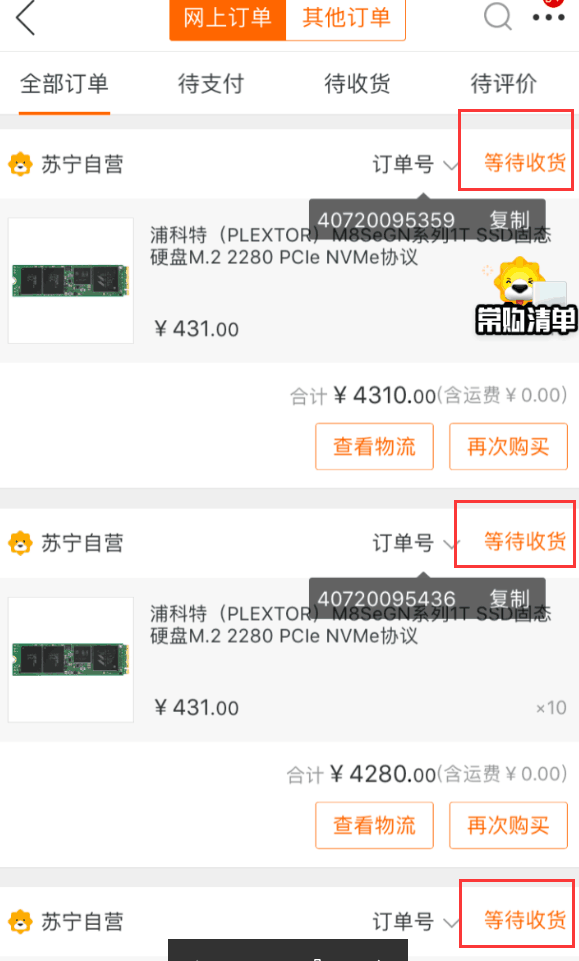 齐先生是越先生的同事,他得知苏宁易购在低价销售这款硬盘后,下单买了10台。他的遭遇比越先生要好一些,订单并没有被取消,但是时至今日,已经过去了一周,订单状态仍然是处于“待收货”状态,他还没有收到所购硬盘。