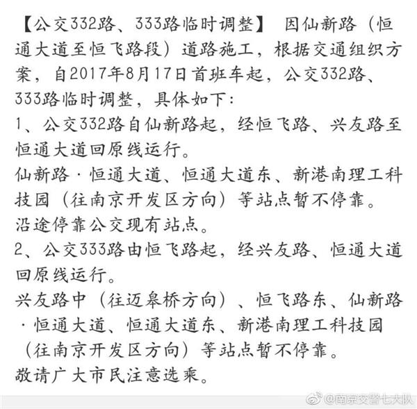 南京交警七大队通报, 因仙新路道路施工,自2017年8月17日至2017年12月31日,南京仙新路(恒通大道至恒飞路段)禁止车辆通行(弓箭玻璃厂车辆除外),恒通大道(仙新路路口向西150米)禁止车辆通行,请过往机动车驾驶人自觉遵守。