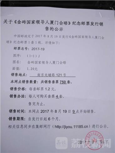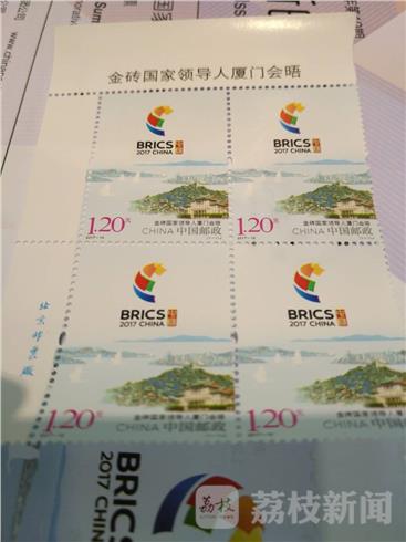 金砖国家领导人第九次会晤9月3日至5日在厦门举办。中国邮政今天,8月19日发行《金砖国家领导人厦门会晤》纪念邮票。荔枝新闻记者上午在南京火车站旁边的南京集邮中心看到,百余名市民前来购买这一邮票及首日封。