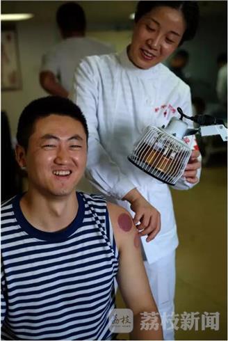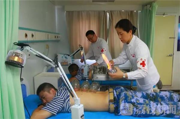 ▲和平方舟医护人员在主平台门诊为护航官兵拔火罐