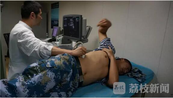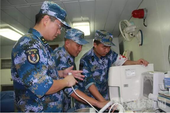 ▲和平方舟医护人员在主平台为扬州舰舰员进行B超检查