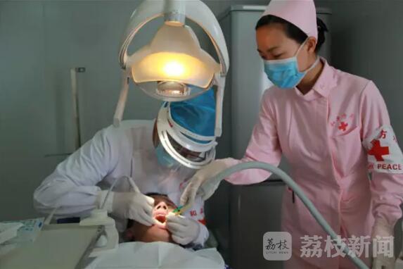 ▲和平方舟医护人员在主平台门诊为护航官兵治疗牙疾