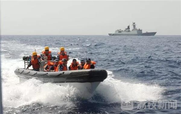 ▲ 和平方舟医护人员通过小艇将张春燕(左前)接往和平方舟时,不远处的中国海军黄冈舰正在伴随护航