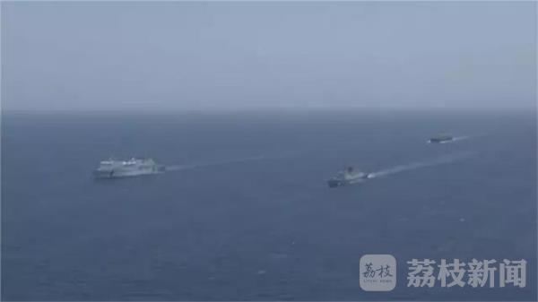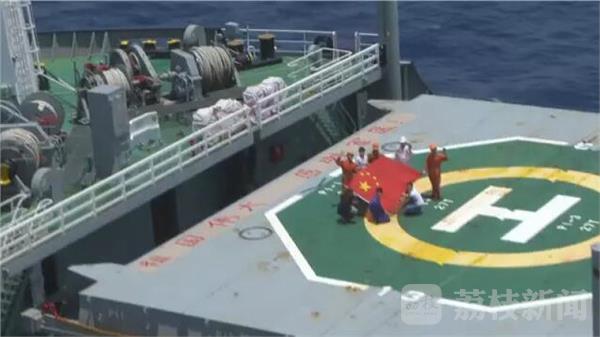 ▲ 执行空中警戒任务的中国海军黄冈舰舰载直升机无意中拍摄到“腾达”号船员挥动国旗致敬的画面,而他们身后的平台上,一行红色大字“祖国伟大、感谢军医”特别显目。