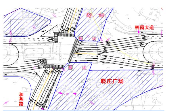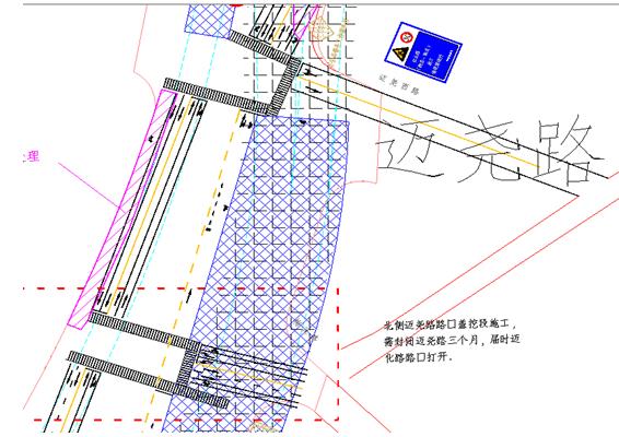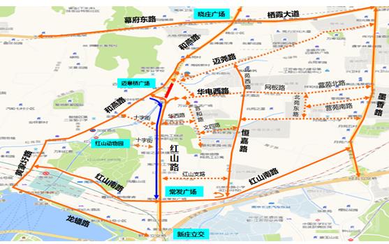 具体如下:一、施工道路围挡及交通组织施工总体约6.2公里,分为三个标段同步实施围挡,围挡总体分为二期,预计一期施工于今年12月结束。一期围挡迁移管线,对道路两侧进行围挡,和燕路-红山路由双向8车道变为双向4车道通行,两侧各留有2米宽非机动车道。具体情况如下:1、红山南路至迈皋桥广场段机动车双向4车道,两侧各留有2米宽非机动车道。(1)红山路-红山南路南口禁止直行及左转,只允许车辆右转驶往恒嘉路,再由恒嘉路去往迈皋桥广场、晓庄方向。车辆也可在红山南路-恒嘉路路口调头,再向北或向西行驶。二期红山路(新庄立交-红山南路段)仅允许南向北单行。 (2) 红山路-红山支路交叉口:南北向禁止左转,东口正常通行,西侧公交场站的车辆可由恒嘉路左转至红山支路,然后直行进入场站。红山路-十字街(南侧)交叉口为T型路口,一期南口禁止左转,二期南口、西口禁止左转。红山路-华西路交叉口:西口维持现状西向东单行,南北向禁止左转。2、迈皋桥广场段封闭东侧道路,西侧道路改为双向通行,最窄处机动车双向4车道,两侧各留有2米宽非机动车道。 3、迈尧路至晓庄广场以北段,双向4车道通行,两侧各留有2米宽非机动车道。和燕路迈尧路路口的南北方向禁止机动车左转。 4、晓庄广场施工分为四期,各方向正常转向,条件最差的阶段路口渠化如图示。 二期围挡开挖隧道主体,对道路中间进行围挡,机动车及非机动车在道路两侧通行,机动车单方向各一股车道,两侧各留有1.6-2米宽非机动车道;和燕路二期与一期一致,交通组织未发生变化,仍为机动车双向4车道,两侧各留有2米宽非机动车道。
