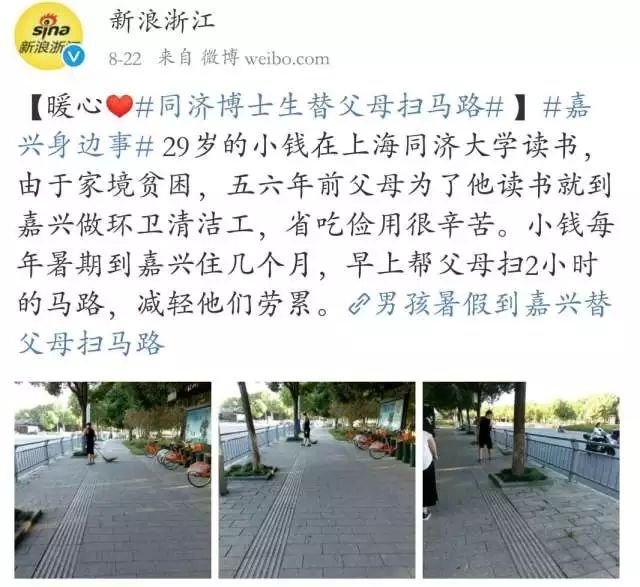 @用户g85yytjm4z:好多人总会瞧不起那些扫马路的,这是人之所常,难以避免。再瞧不起人也不能瞧不起自己的父母。难能可贵的是博士生放下身架扫马路,扫去心垢,扫出孝心。