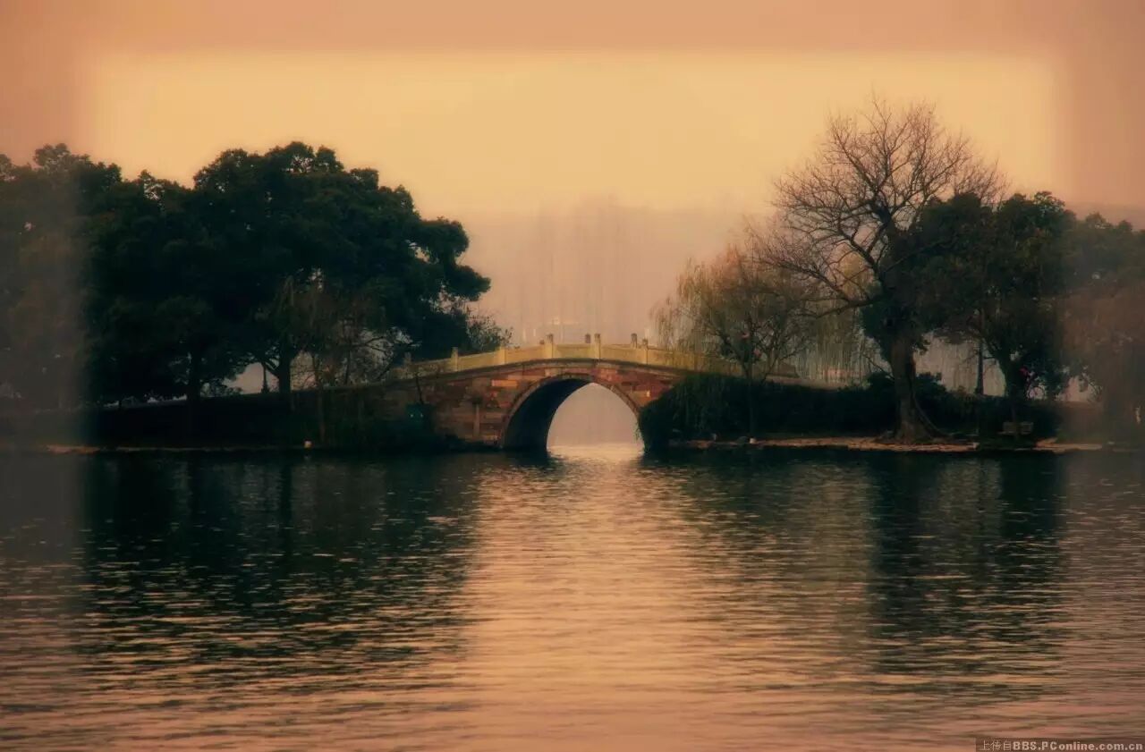 在西湖边我常见到湖边长椅上坐着的老人,他们很沉静很专注地地那样坐着,好像是在思念前生。而在离他们不远的断桥,新婚的彩车一队队驶过,许多新郎新娘在这里下车,沿着湖边走走,拍段录像。新娘鲜红的玫瑰和轻柔洁白的婚纱使他们分外美丽,如同传说中的白娘子。