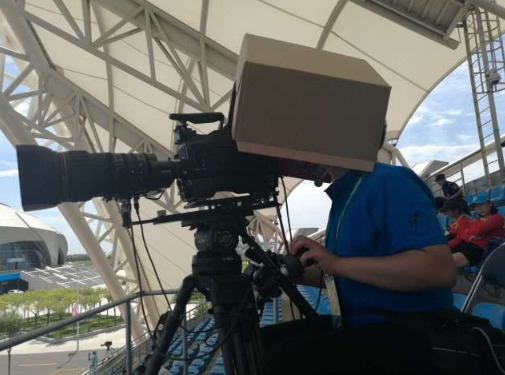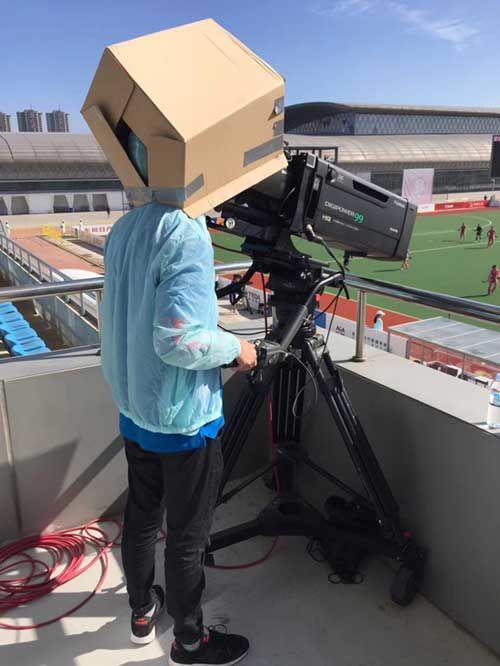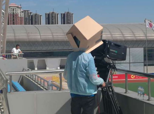 转播团队自制“纸箱”,帮助摄像师遮挡光线,甄乐和他的几个同事于是变身“纸箱侠”。比赛间隙,新华社记者得到甄乐的允许也客串了一下“纸箱侠”,头钻进纸箱里,寻像器的画面确实清晰了许多,但是寻像器和前面透进来的强光仍有较大的反差,长时间盯着看眼睛必然会不舒服。