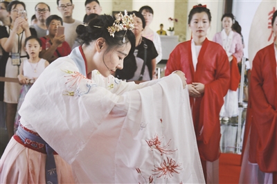 在遗址公园的天王殿展厅,一系列精彩的七夕乞巧民俗互动项目将竞相上演。表演者依次在执事面前盥洗双手,参拜魁星并接受魁星点斗,参拜织女与董永并许愿,并和现场的市民、游客一起动手,体验穿针斗巧,结绳斗巧,制作磨合乐等“斗巧”活动。 扬子晚报记者 张可 文/摄