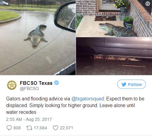 根据得州本德堡县治安官办公室发布的建议,当地居民应该“做好鳄鱼出逃的准备。一旦发现鳄鱼,不要与其接触,而是跑到高地等待水位退去。”