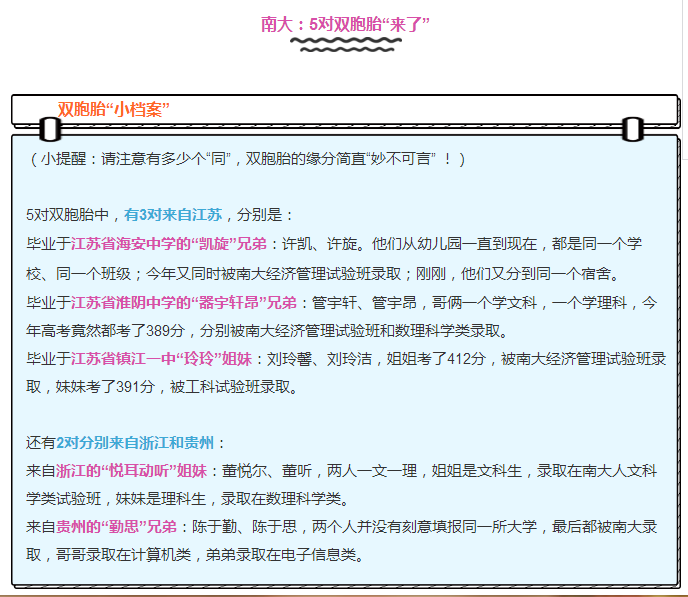 (江苏教育)今天,南京大学迎来9000多名新生,其中本科生约3260余名,硕士和博士研究生约6100余名。特别值得一提的是,今年有5对双胞胎本科新生同时入学,不得了!大写的“服了”!先来一张双胞胎“全家福”吧!