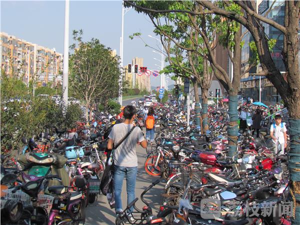 近日,有市民坐地铁到南京桥北天润城站,看到百润路与天华东路,大量自行车包围四个路口,快、慢车道上千辆自行车乱停乱放,甚至斑马线上停满车辆,一片混乱。不少过马路或急着乘坐地铁的市民,只能在车海中穿行、十分不便,严重影响了交通和市容。