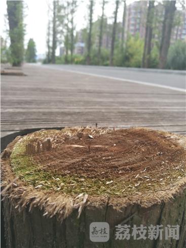 8月30号下午,记者来到南京江心洲中新大道,原先较窄的一段穿洲公路——“水杉路”被保留成非机动车道和人行步道,成为了一道亮丽的风景。但周边居民反映,修路之后,数十棵高大的水杉树出现了枯萎的情况,有的已经被砍掉,风景变为成排的“伤疤”。