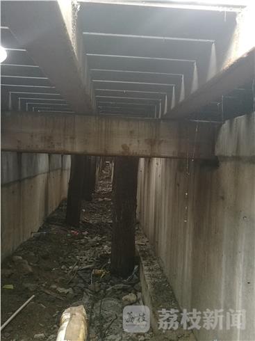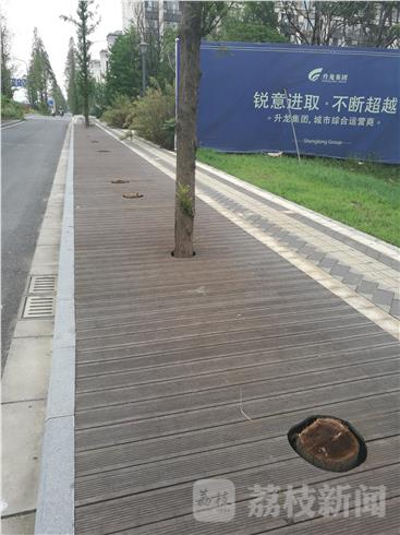 记者在现场仔细察看发现,这一条南北长约500米的路段有近百棵水杉树,修路时,树两侧的路面被升高了1米左右,树木像生活在一个长条形凹池内,尽管池底还是原先的土壤,但侧壁成为水泥墙,池顶用木制人行道板盖住。