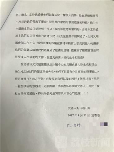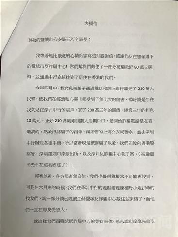 “是你们给在黑暗和痛苦中的我们带来曙光,是你们让我感受到祖国的温暖,是你们在切切实实地保卫着人民的生命和财产安全……”写下这些恳切真挚感谢话语的是香港居民吴女士,和不少人一样,吴女士也是一位通讯诈骗的受害者。今年4月,她和女儿存在深圳某银行用于理财的210万元到期,就在这个节骨眼上,女儿接到了一个自称是公安的电话,电话里,女儿被告知账户涉嫌洗黑钱,需要在“警方”的指导下进行相关的账户操作,由于第一次经历这事,吴女士的女儿一下子慌了神,加之电话中传来的阵阵警笛声,让吴女士的女儿信以为真,随后便按照骗子的要求来到ATM机前插入了银行卡……这一通电话,让吴女士和女儿的辛辛苦苦积攒的210万元打了水漂,等到她们回过神来,后悔得捶胸顿足,正如吴女士在信中所写“觉得钱根本不可能再找到”。而令她们没想到的是,自已的遭遇在2000公里外的盐城有了转机。