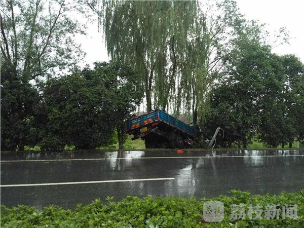 9月3日下午2时许在兴化231省道陈堡红绿灯北侧2公里处一辆蓝色大卡车不慎冲到公路西侧的护坡下面,导致车辆悬在省道边,所幸驾驶员和车辆并无大碍,交警友情提醒广大交通参与者雨天路滑请谨慎驾驶。 笔者接到爆料赶到现场时,只见一辆蓝色的大卡车尾部朝南,头部朝北栽在省道下面。路边的一根路灯杆也被拦腰折断,所幸由于树的遮挡车子没有坠到公路下面,车上人员也没有受伤,据驾驶员介绍因为避让其他车辆,导致车子滑到马路下面。